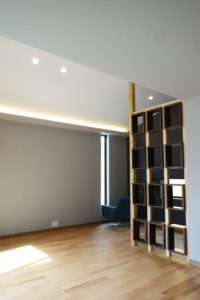 リビングには勾配天井や間接照明、庭に面する窓を設けたり、化粧柱のスリットで作られた魅せる収納棚を仕切り代わりに半個室の書斎スペースがあったりと、空間を広く明るく開放的に見える間取りプランニングと工夫がされていました((o_(エ)_)o