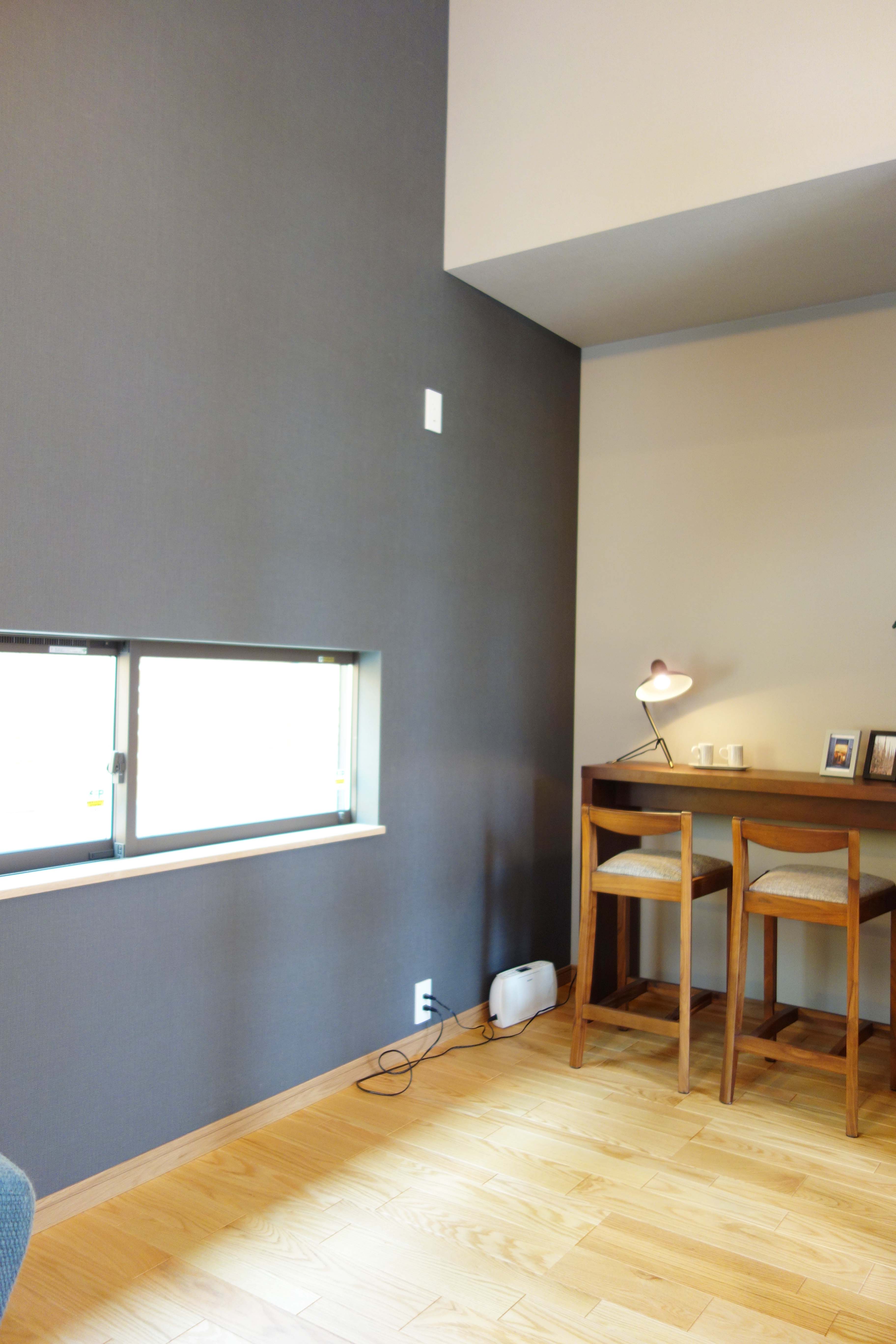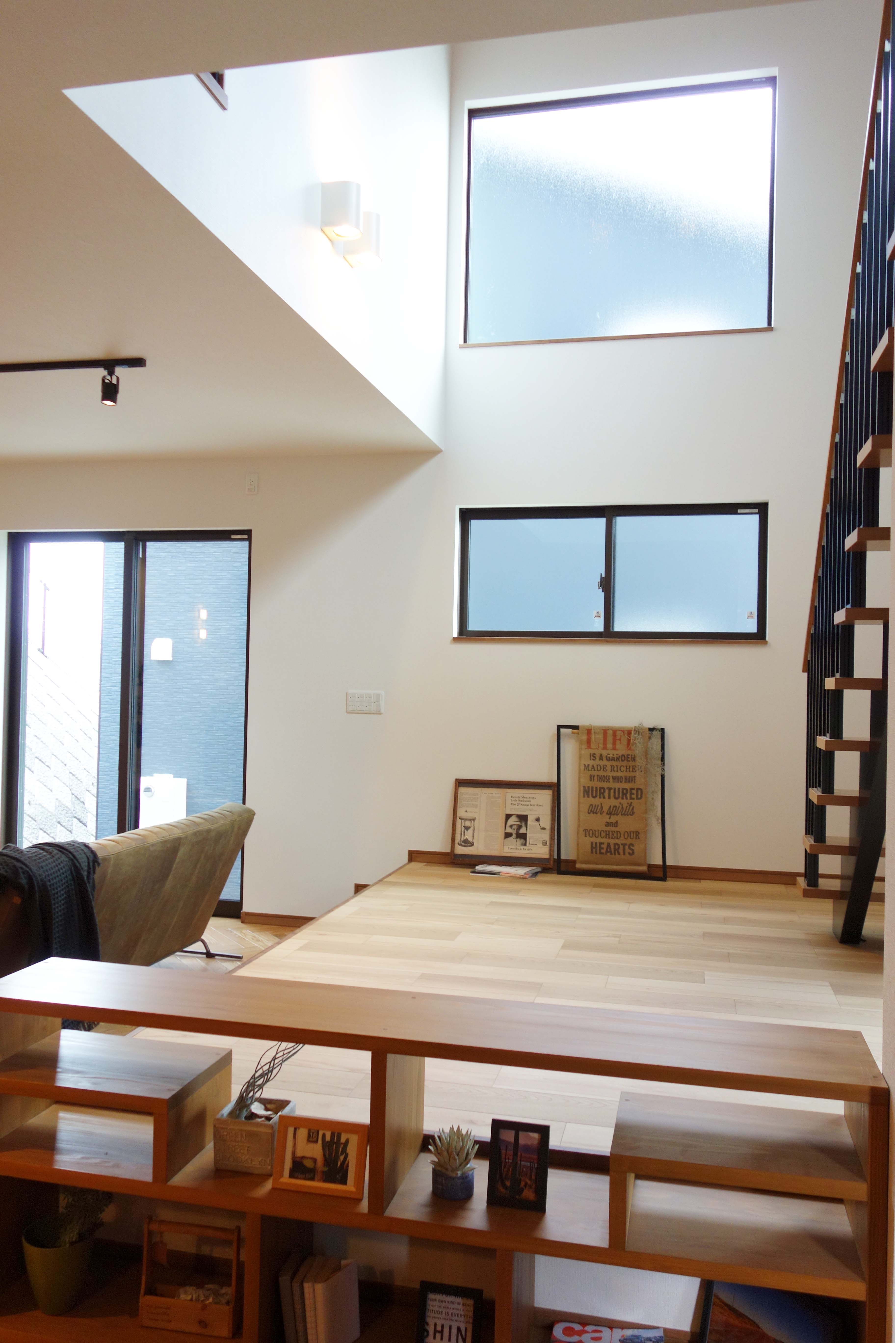 リビングには勾配天井や間接照明、庭に面する窓を設けたり、化粧柱のスリットで作られた魅せる収納棚を仕切り代わりに半個室の書斎スペースがあったりと、空間を広く明るく開放的に見える間取りプランニングと工夫がされていました((o_(エ)_)o