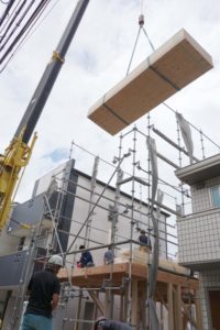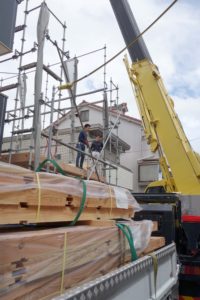段取り良く2階部分の床材が張られたら、いざクレーンにて柱や合板等々の部材の吊り上げです☆