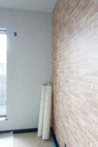 リビングは流行りのヴィンテージテイストを取り入れたレンガパターンやモルタル風の壁紙を上手く合わせたりと