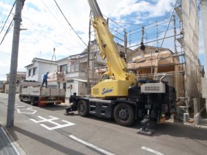 午前中現場へ伺うと清々しいほど秋晴れの中、クレーン作業が開始!!