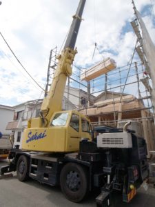 お家のフレームとなる構造材を吊り上げて、2階部分へと荷揚げしていきます♪