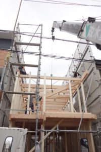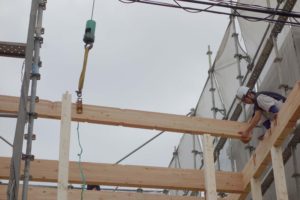 柱と柱をつないで3階部分の土台となる 大きくて重い梁は、クレーンを使って1本1本丁寧に吊り上げて、、