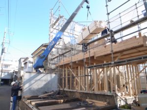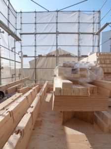 ワタクシも午前中に建築現場へ伺いましたが、ユニックと呼ばれるクレーン付きトラックで柱や梁、床となる建材を吊り上げて2階部分へと運搬している最中でした⊂( ̄(工) ̄)⊃