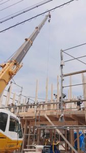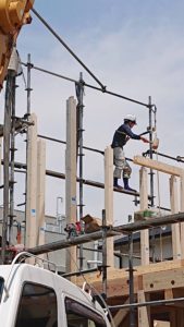 朝から始まった1階部分の作業が終わり、2階部分の柱を立て、梁の組み作業中☆★
