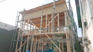 その後も作業は進み、昼下がりから夕方にかけて再度現地に伺いましたが、屋根の部分まで完成してお家の形がしっかりお目見えしました!