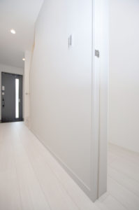 室内もアクセントクロスをコンセプトカラーのブルー、床材のフローリングやフロアドア・クローゼットドアなどの室内建具をオーク柄にする事で、自然の木目を感じる”カフェテイスト”の仕上がりとなりました(。'(ェ)’)σ