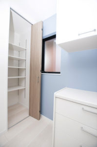室内もアクセントクロスをコンセプトカラーのブルー、床材のフローリングやフロアドア・クローゼットドアなどの室内建具をオーク柄にする事で、自然の木目を感じる”カフェテイスト”の仕上がりとなりました(。'(ェ)’)σ