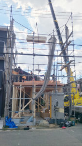 クレーン車を用いて建築資材を吊り上げていく真っ最中です\(・`(ェ)・)/