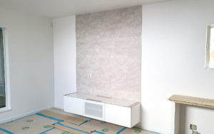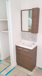 高槻市のお客様邸では洗面などの水周りや壁付けのテレビボードなどの設備が設置されて、その壁面には空気清浄や湿調効果などが期待できるエコカラットのアクセントタイルが張られました♪