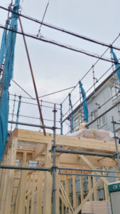 この日は1階床部分から更に柱と梁を立ち上げて、2階部分の完成まで作業を行いました(ノ ̄(エ) ̄)丿丿