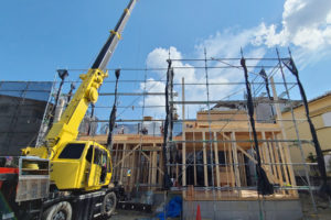 棟上げ当日は午前中に現場チェックへ伺いましたが、お家の2階部分へとクレーン車で木材を運び上げる作業の真っ只中〆ヾ( ̄(エ) ̄*)