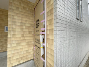 落ち着いた色合いと清潔感のある白系統の外壁をベースに、アクセントとして玄関周りに天然木調のサイディングを合わせて、ぐっとナチュラルな印象に仕上がりました♪
