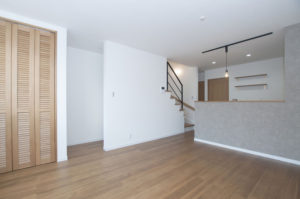 フローリングをはじめ、クローゼットドアやキッチン家具・飾り棚など、ヴィンテージ風の木の質感に、黒アイアンを使ったリビング階段の組み合わせがGOODd(。ゝ(ェ)・)b