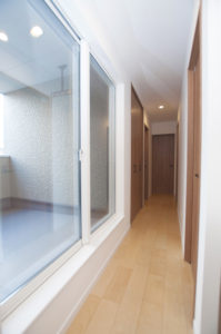廊下部分には、近頃採用される方が多い”手洗い用の洗面器”や、インナーバルコニーに繋がる大きな掃き出し窓もあります(* ̄(エ) ̄)/°