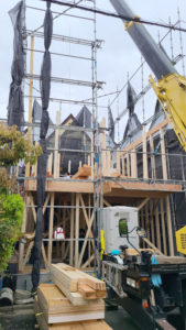 午前中に現地へ伺いましたが、1階から2階床まで早々と完成し、クレーン車を使い建築資材を吊り上げている最中です(/ ‘(ェ)’)(・(ェ)・。)/