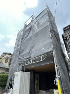 ただいま お家内部の大工工事が進んでおりますが、お家の外側の”外壁工事”が終了しました♪