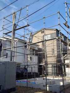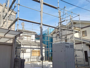 これから建てるお家の周辺に足場を組み立てることで、大工さんが安全に効率的に工事ができるようにするための工事です!
