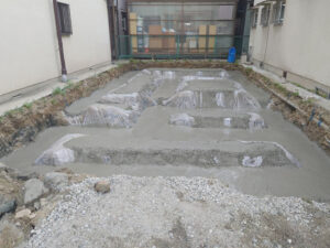 この日は砕石を敷き詰めて地盤を固めたのち、”捨てコン”と呼ばれる作業中です!