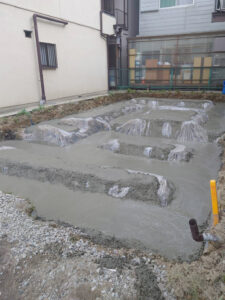 捨てコンとは捨てコンクリートの略で、実際の基礎を立てる前準備♪