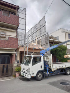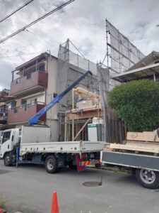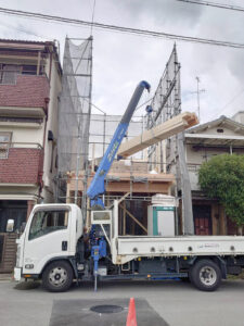 ユニックで柱や梁などの建材を吊り上げて、2階へと運搬中です☆