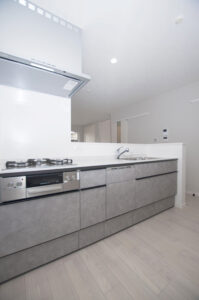 キッチンもモダンな装いに合わせて、グレージュスタッコをチョイス!