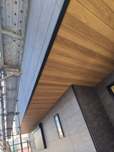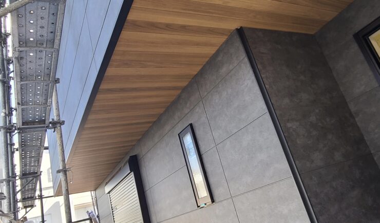 玄関周りや庇の軒天は、木目調のオークヴィンテージを採用!