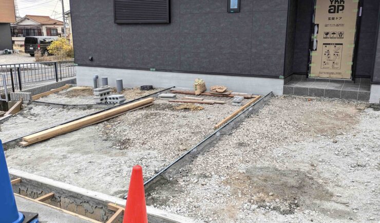 外構工事とは”エクステリア工事”とも呼ばれますが、お家の敷地(建物以外の外側)に関する工事のことで、玄関先や駐車場の土間打ち・門柱の設置工事などが行われます!