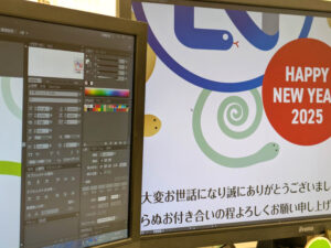 来年の干支の巳(ヘビ)を取り入れたデザインで、ただいま作成中(。'(ェ)’)σ)/。
