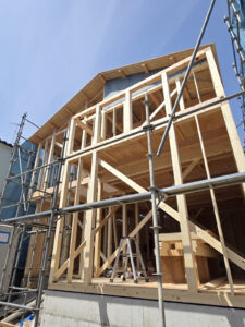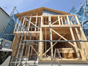 午前中に現場チェックに伺った際は、2階部分の立ち上げが行われておりましたが、昼下がりに再度現場に伺うと棟木が上がり屋根の形が出来上がりました☆