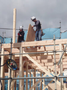 普段は1~2人で建築工事をする大工さん達ですが、棟上げの際には大勢の大工さんが応援に駆けつけて、1日で棟木(屋根の1番高いところ)まで組み上げてゆきます[≡]ヽ(・(ェ)・ヽ)