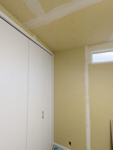 下地処理と呼ばれますが、壁紙を張りつける石膏ボードには、釘やビスの穴やボードの継ぎ目などがあるのでその凹凸をなくして平にする作業です!