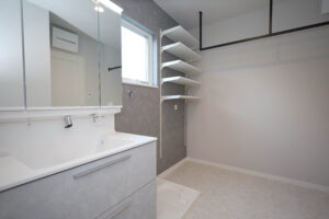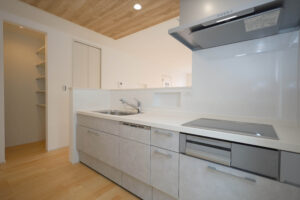 キッチンには背面カップボードや可動棚式のキッチンパントリー、洗面室兼ランドリールーム