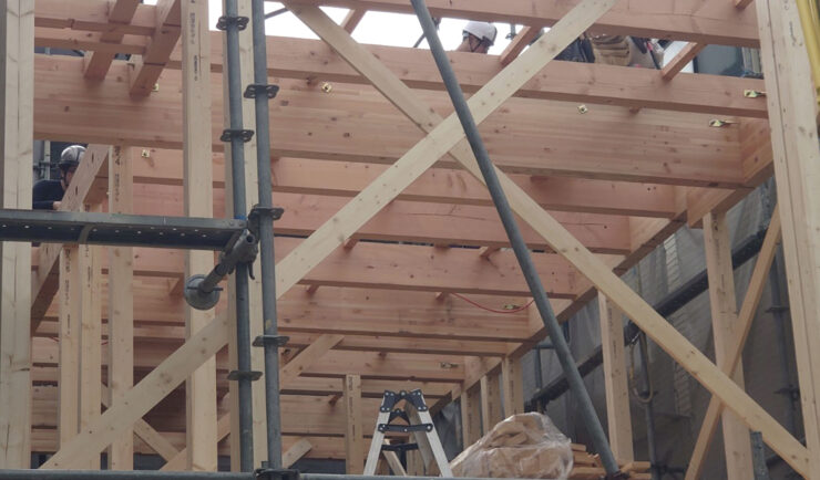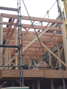 午前中に建築現場へ伺いましたが、2階の柱が打ち込まれて、その上に太い梁が掛かっています!