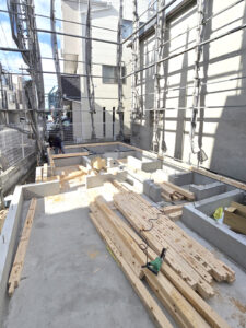 土台敷きとは、基礎コンクリートの上に木材を設置し、お家の1階床部分の骨組みを組んでいく作業です!