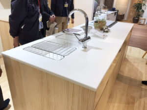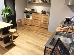 目玉商品の無垢の木を使ったキッチンを中心に、フローリング・ドア・キッチンの収納までトータルコーディネートで、LDKまるごと無垢の空間 v( ̄(エ) ̄”v)
