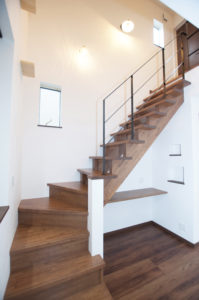 メインのリビングには黒アイアンの手すりがオシャレなスリット階段や、愛猫家のお施主さんらしい吹き抜けから見えるキャットウォークがあって開放的で遊び心あふれる空間に仕上がっています♪(・(ェ)・。)/