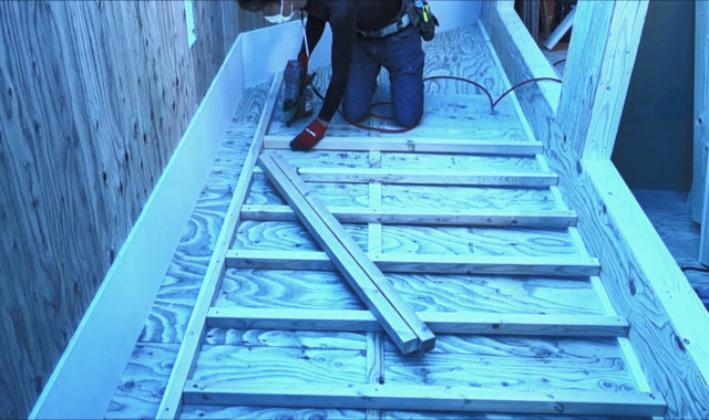 現在建築中の摂津市鳥飼野々より☆★ただいまバルコニー部分の床下地作り中!床板を支えるための根太を等間隔に打ち込んでゆきます(/ ‘(ェ)’)/動画では水平に見えますが、実は右側から左へ緩やかに勾配がかかっています!雨が降った時に