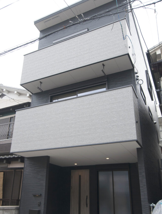 ブラック×グレーの組み合わせがクールな印象のファサード玄関ドアや軒天を外壁アクセントの同系色に合わせることで、更に統一感がアップしていま
