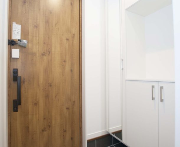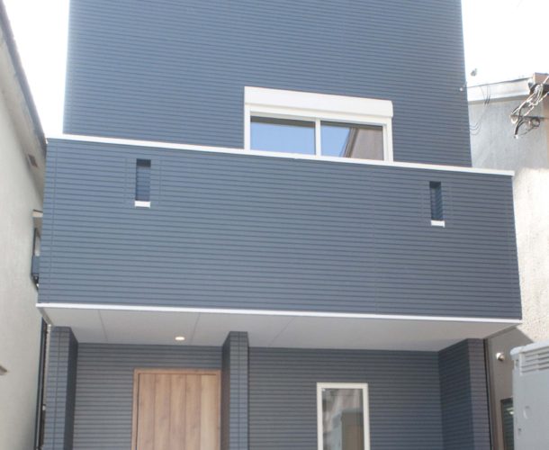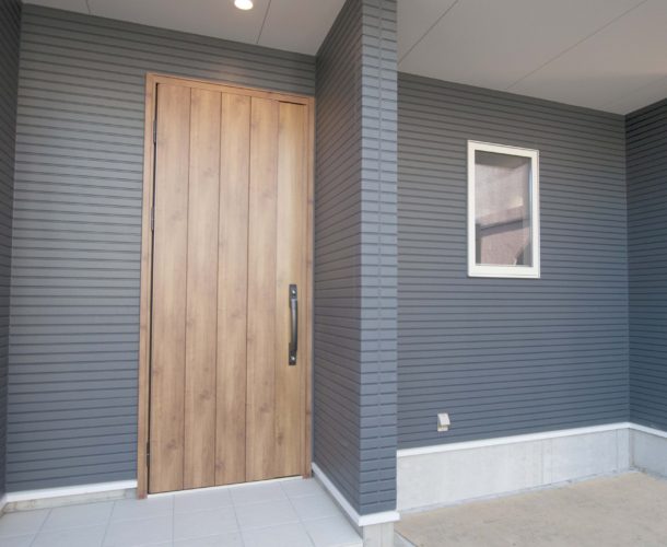 黒ベースにヴィンテージウッド調の玄関ドアや白のサッシでカジュアルさをプラスしたオシャレなお家