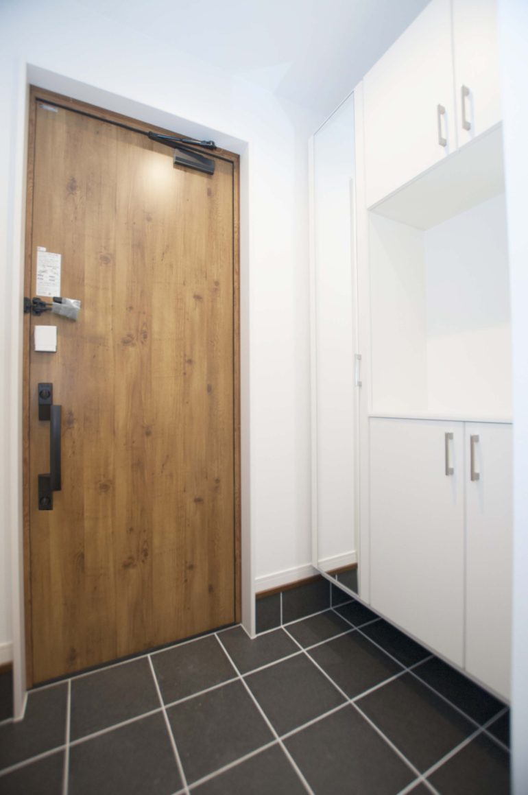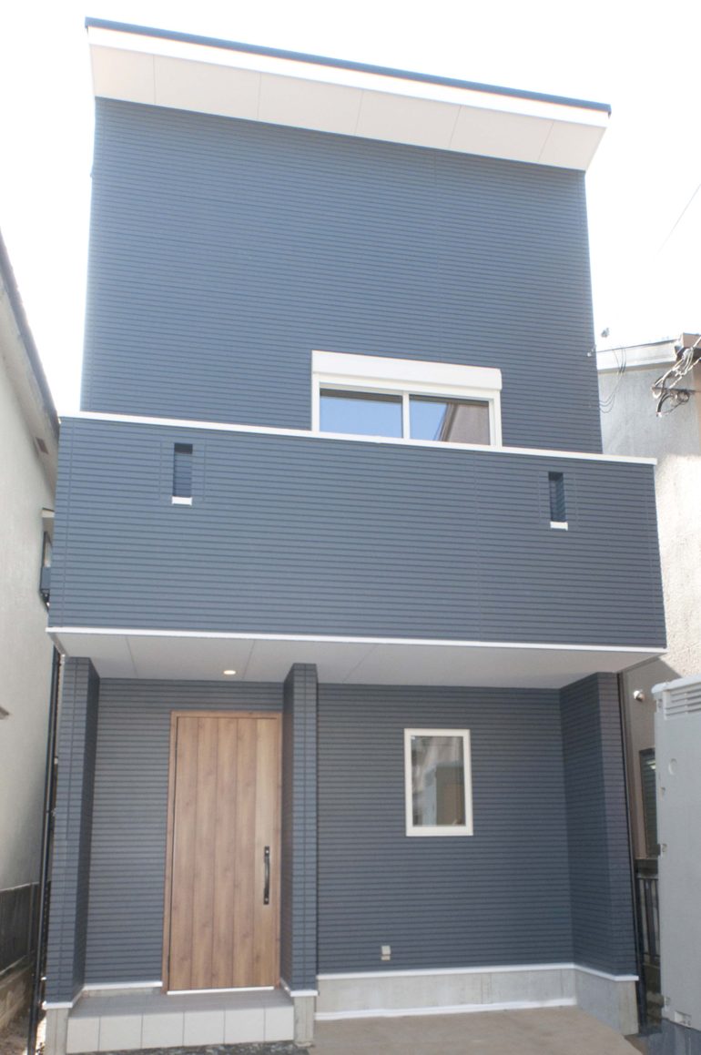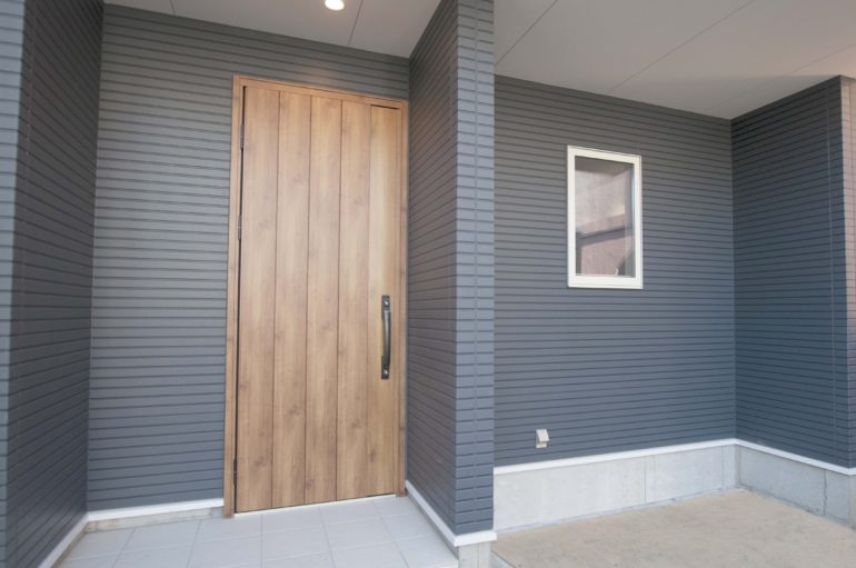 黒ベースにヴィンテージウッド調の玄関ドアや白のサッシでカジュアルさをプラスしたオシャレなお家