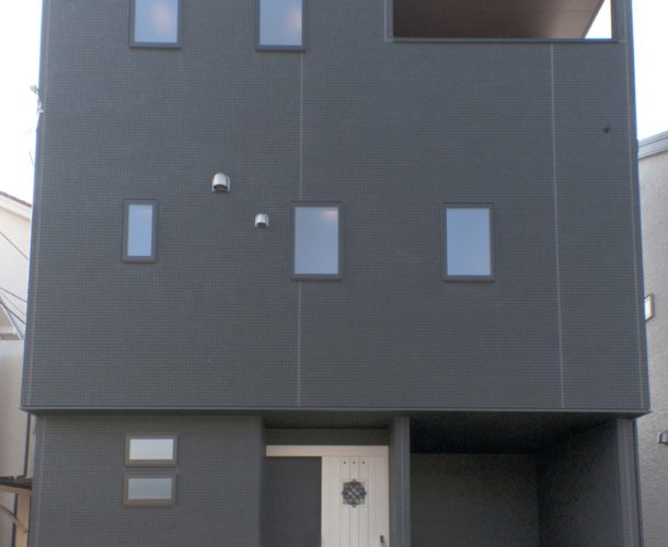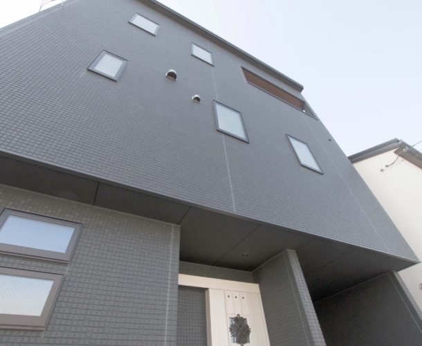 ブラウンウッド調の軒天をアクセントに、オールブラックで統一したスタイリッシュな外観デザイン