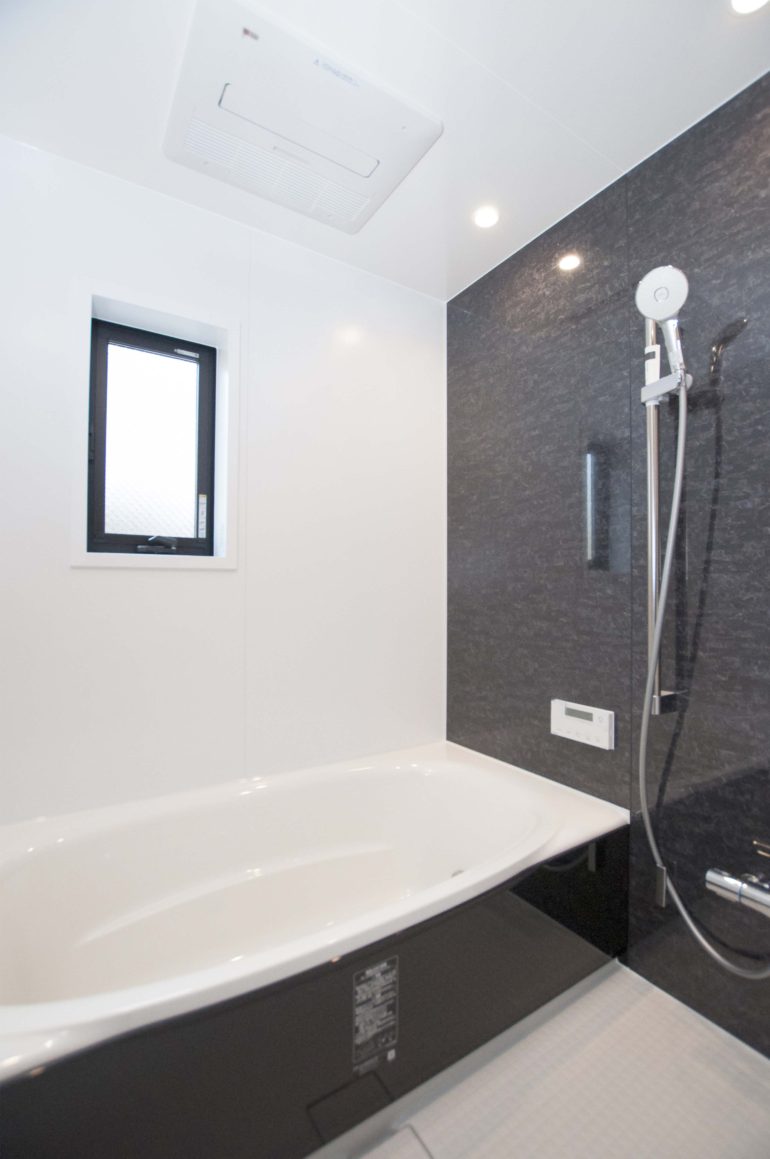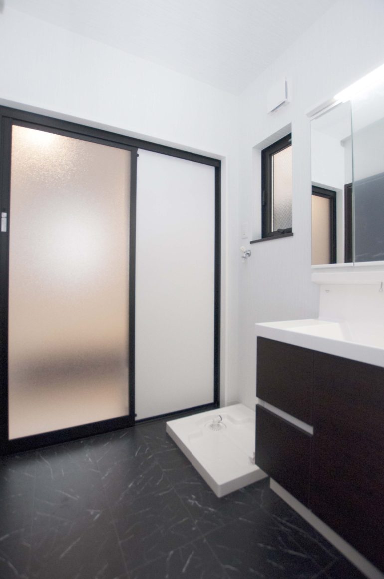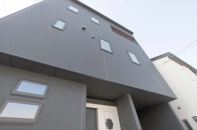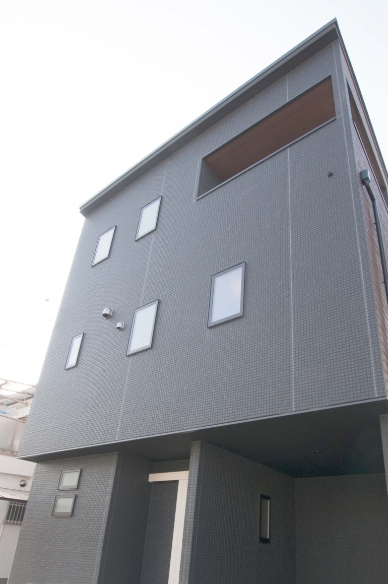 ブラウンウッド調の軒天をアクセントに、オールブラックで統一したスタイリッシュな外観デザイン