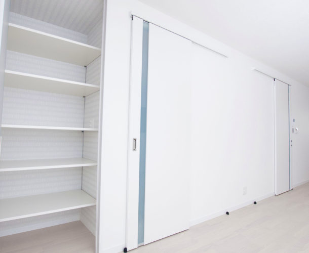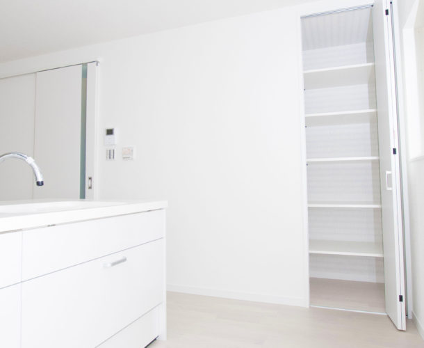 見た目だけではなく、リビング収納やキッチン横の収納棚など収納スペースを多めに確保