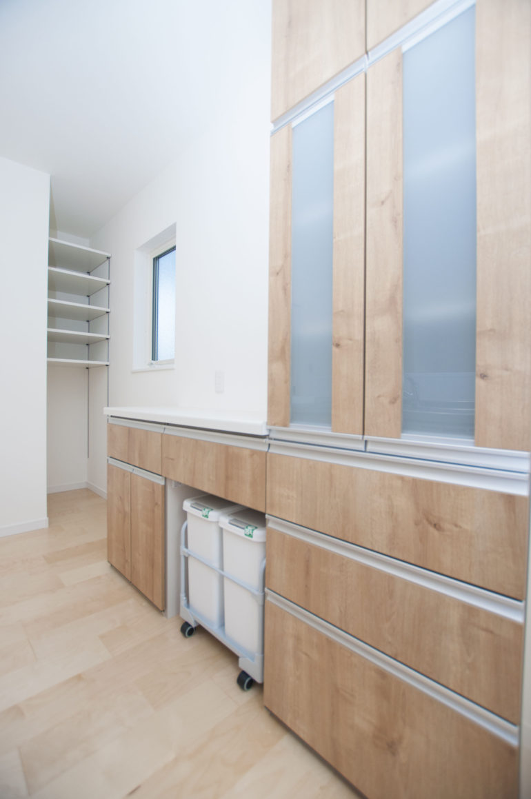 リビング収納やキッチン横の収納棚、大容量のカップボードなど、LDKに収納スペースを多めに確保
