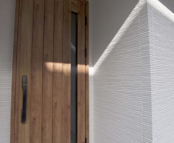 白ベースの外壁にヴィンテージウッド調玄関ドアの組み合わせが印象的