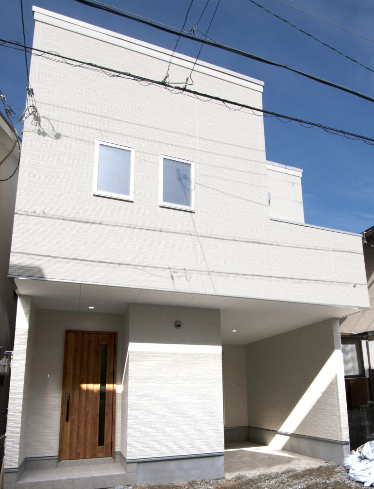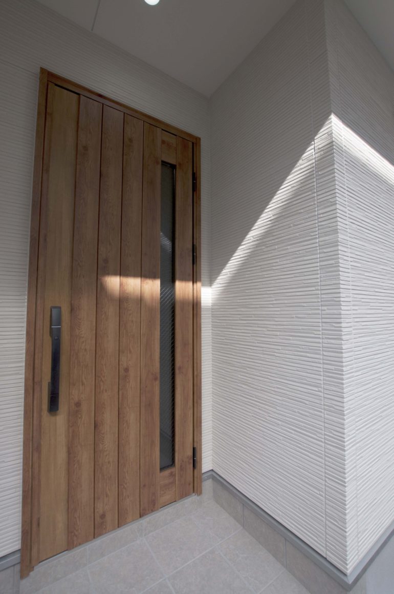 白ベースの外壁にヴィンテージウッド調玄関ドアの組み合わせが印象的