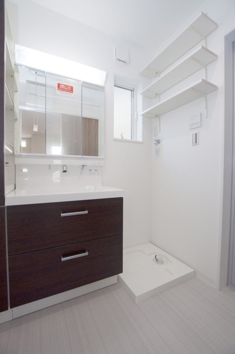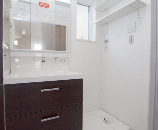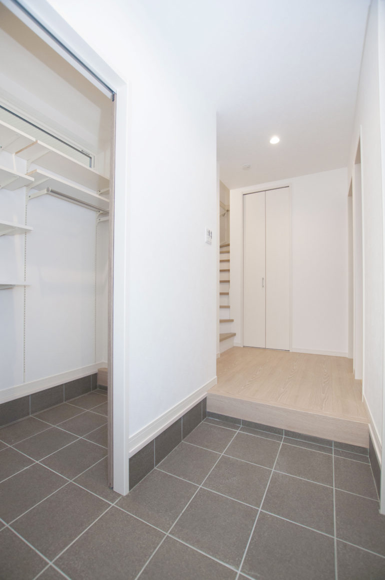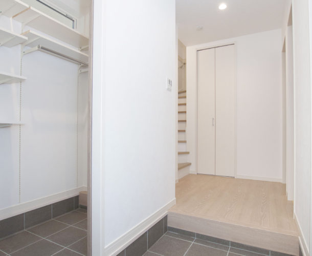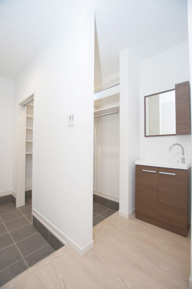 LDK以外にも各部屋収納はもちろん、エントランスにはハンガーパイプ付きのシューズインクローゼットのほか、靴を脱いで玄関を上がる動線に洗面台を設置して手洗いができるように配されています。