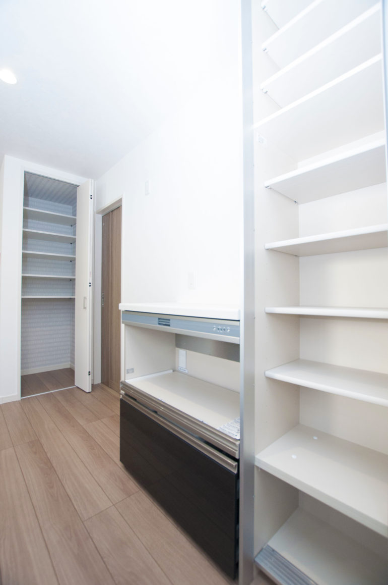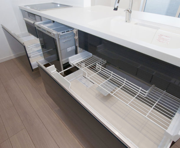 広いリビングにつながるキッチンの大型収納やカップボード、食洗機や自動水栓などの最新設備をはじめ主婦目線のこだわりが詰まっています。