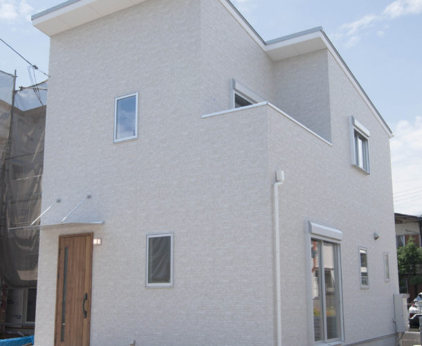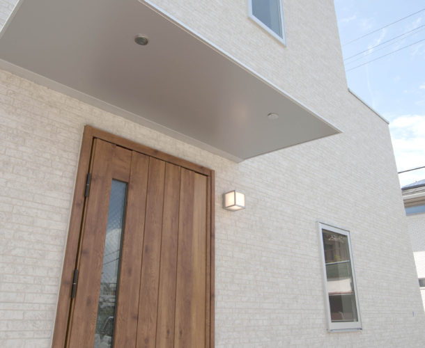 ホワイトの外壁にウッド調の玄関ドアが映えるナチュラルテイストのお家